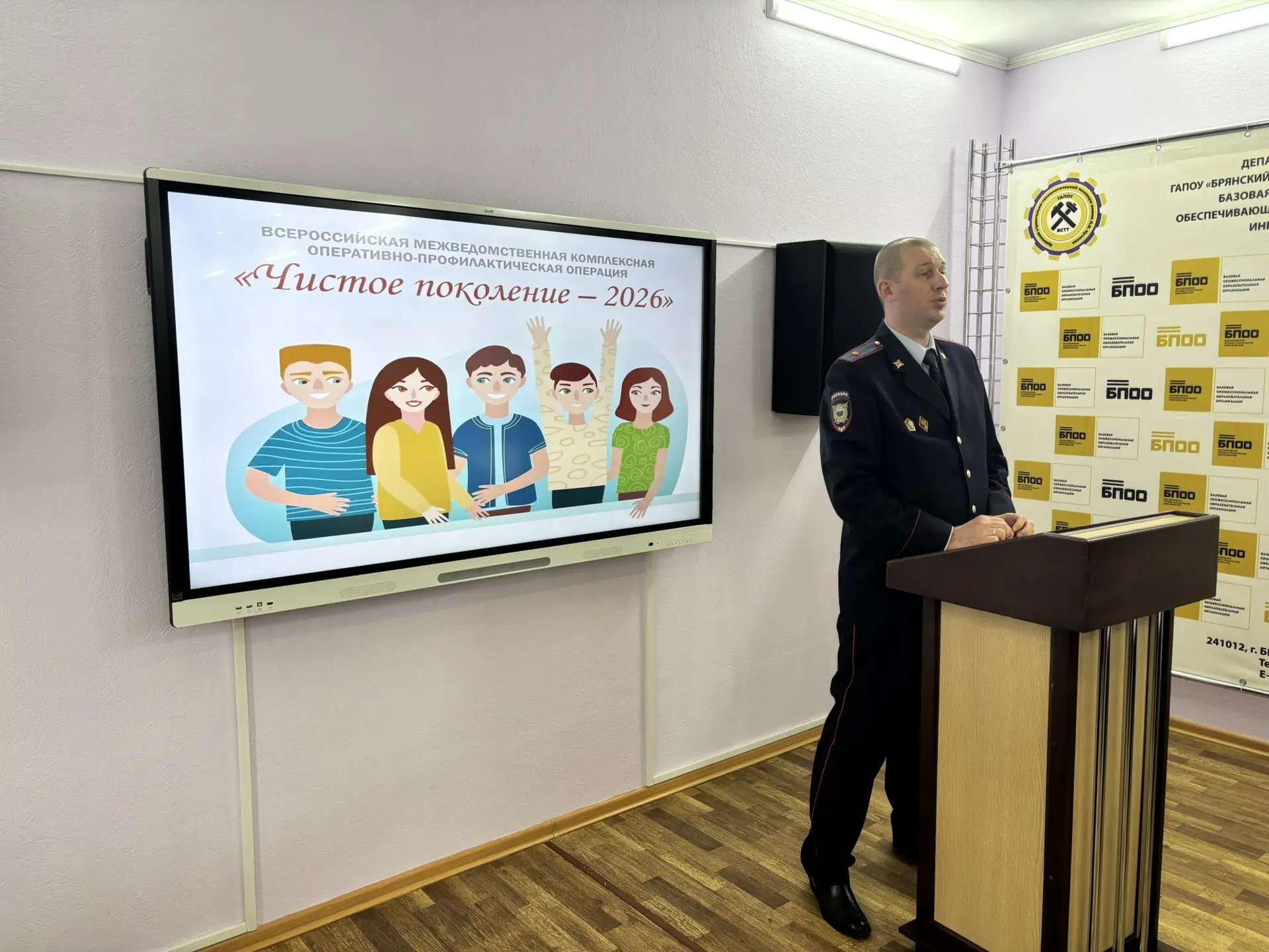 7 апреля 2026 г. в ГАПОУ БСТТ им. Л.Я. Кучеева в рамках Недели здоровья и Всероссийской межведомственной комплексной оперативно-профилактической операции «Чистое поколение-2026» прошла масштабная всероссийская зарядка с участием оперуполномоченного по особо важным делам УМВД России по Брянской области Рябиковым П.В. На первом этаже, в просторном холле, утром собрались все студенты, чтобы зарядиться энергией, позитивом и хорошим настроением на весь день! Мероприятие прошло под руководствомзаместителя директора по учебно‑воспитательной работе и социальным вопросам Кореневой Н. С. и советника директора по воспитанию и взаимодействию с ДОО Степиной К. Д. Вместе мы доказали, что забота о здоровье — это не только полезно, но и весело! А участие в акциях напоминает нам: важно беречь не только себя, но и окружающий мир. Благодарим всех, кто присоединился к зарядке, — студентов за активность, а организаторов за вдохновение и отличную атмосферу!